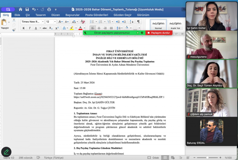 Fırat Üniversitesi İngiliz Dili ve Edebiyatı Bölümü tarafından yürütülen kalite güvencesi ve akreditasyon çalışmaları kapsamında, dış paydaş katılımını güçlendirmek amacıyla bir toplantı gerçekleştirildi. Toplantı, bölümün dış paydaşları arasında yer alan Aydın Adnan Menderes Üniversitesi İngiliz Dili ve Edebiyatı Bölümü akademisyenlerinin katılımıyla çevrim içi olarak düzenlendi.